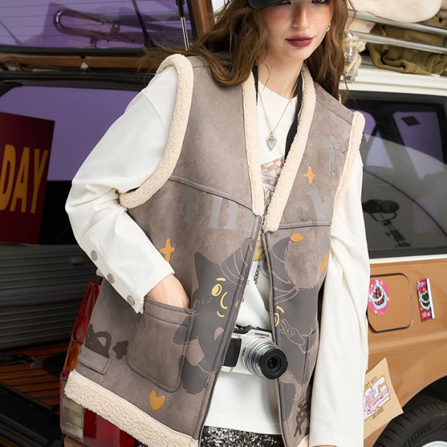 What sets this vest apart is its charming contrast of soft luxury and playful design. The full cartoon and star print gives it a fun, youthful look, while the suede-style fabric and furry texture keep it looking polished and stylish. The V-neck cut flatters the upper body and makes it easy to pair with layered necklaces or scarves. Plus, it has functional pockets and a front zipper for everyday convenience.